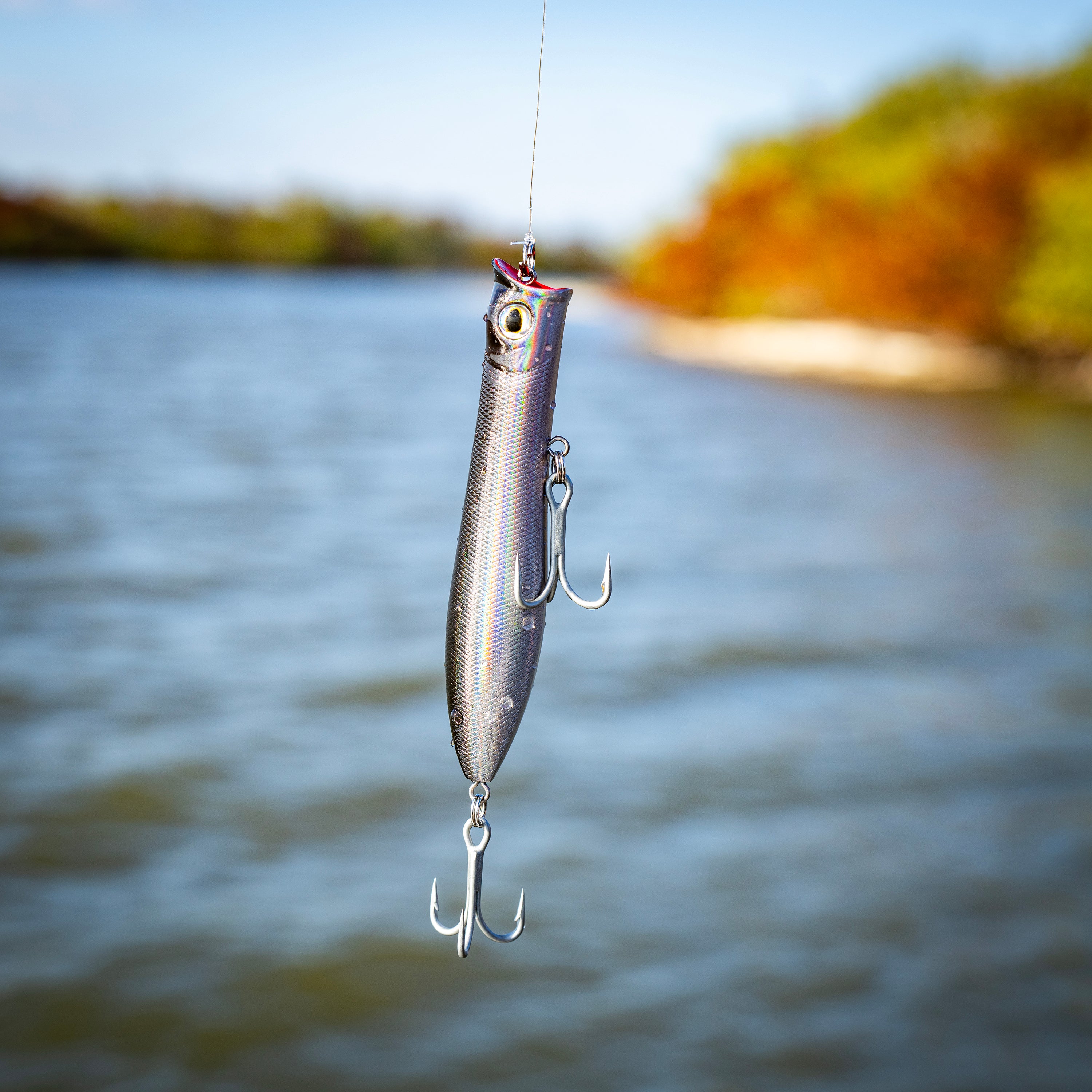 This floating top water lure delivers a popping, splashing, skittering action to draw reaction strikes from predators. The perfect popper for striped bass, bluefish, tarpon, redfish, and more! Slow retrieves can even make them act as gurglers on quiet tides. Large weight transfer balls inside each high impact body provide long, stable casts and loud, fish attracting rattles.